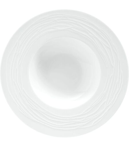 Weißer Teller aus Porzellan. Mit extravagantem Relief auf der Tellerfahne. Spülmaschinenfest und mikrowellengeeignet. ...