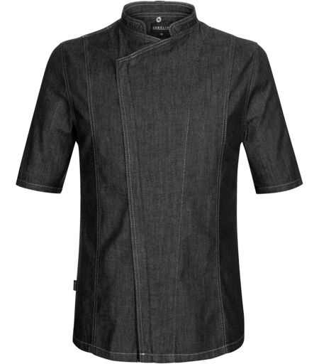 100 % Baumwolle. 212 g/m². 40°-Wäsche. Sportliche Kochjacke für Herren aus leichtem Denim-Stoff mit Reißverschluss, Stehkragen, Kurzarm und Latzschürzenschlaufe im Nacken. Linker Ärmel mit zweigeteilter Oberarmtasche. Auch in Langarm erhältlich. Leicht tailliert geschnitten. Rückenlänge: 77,5 cm in Gr 50 ...
