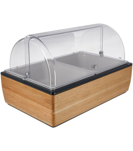 Kühlvitrine besteht aus der Grundbox hoch aus massivem Eichenholz mit MDF Blende, einer Basisschale aus hochwertigem Kunststoff mit einer Hitzebeständigkeit bis 70 °C, dem passenden Kühlakku aus Polyethylen, 2x dem weißen, 10 cm tiefen, stapelbaren, stoß- und bruchfesten GN-Behälter 1/2 aus Melamin (Einsatzbereich: -30 °C bis +70 °C) und der bruchsicheren Rolltophaube Sturgis aus hochwertigem Tritan (Bisphenol A -frei) mit rutschfester Anschlagsgummierung für leises Öffnen und Schließen. Der GN-Behälter ist spülmaschinenfest, alle anderen Teile nicht. ...