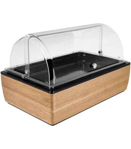 Kühlvitrine besteht aus der Grundbox hoch aus massivem Eichenholz mit MDF Blende, einer Basisschale aus hochwertigem Kunststoff mit einer Hitzebeständigkeit bis 70 °C, dem passenden Kühlakku aus Polyethylen, dem schwarzen, 6,5 cm tiefen, stapelbaren, stoß- und bruchfesten GN-Behälter 1/1 aus Melamin (Einsatzbereich: -30 °C bis +70 °C) und der bruchsicheren Rolltophaube Sturgis aus hochwertigem Tritan (Bisphenol A -frei) mit rutschfester Anschlagsgummierung für leises Öffnen und Schließen. Der GN-Behälter ist spülmaschinenfest, alle anderen Teile nicht. ...