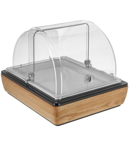 Kühlvitrine besteht aus der Grundbox flach 1/2 aus massivem Eichenholz mit MDF Blende, einer Basisschale aus hochwertigem Kunststoff mit einer Hitzebeständigkeit bis 70 °C, dem passenden Kühlakku aus Polyethylen, der weißen, stapelbaren, stoß- und bruchfesten Präsentationsplatte aus Melamin im 1/2 GN-Maß (Einsatzbereich: -30 °C bis +70 °C) und der bruchsicheren Rolltophaube Sturgis aus hochwertigem Tritan (Bisphenol A -frei) mit rutschfester Anschlagsgummierung für leises Öffnen und Schließen. Die Präsentationsplatte ist spülmaschinenfest, alle anderen Teile nicht. ...
