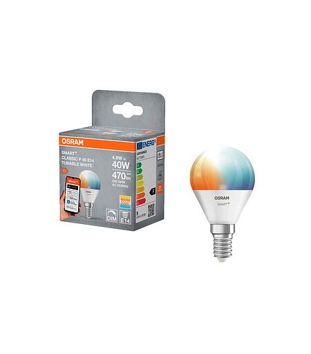 Tauchen Sie Ihre Räume in das für Sie optimale Licht mit der OSRAM LED-Lampe SMART+ MATTER Classic P40 E14 4,9 W mattVorbild in Sachen Energieeffizienz und Langlebigkeit: die OSRAM LED-Lampe SMART+ MATTER Classic P40 E14 4,9 W matt. Mit diesem Modell profitieren Sie von einer cleveren und stromsparenden Art der Beleuchtung. Hiermit ist dieser Artikel kompatibel: Amazon Alexa, Apple HomeKit, Google Assistant, Samsung SmartThings. In folgender Ausführung kommt das Produkt zu Ihnen: matt.Licht in Tunable whiteWas bedeutet "Kelvin"? – Der Wert in Kelvin gibt Auskunft über die Lichttemperatur. Je höher der Kelvin-Wert, desto bläulicher (kälter) wirkt das Licht – umgekehrt gilt: je niedriger der Wert, desto wärmer. Bei diesem Exemplar sind es 2.700-6.500 K. Sie erhalten den Artikel mit der Lichtfarbe tunable white.LED-Technologie: Die VorteileDank der langen Lebensdauer müssen LED-Produkte nur sehr selten ausgewechselt werden, was sie zu einer äußerst umweltschonenden und effizienten Lichtquelle macht. Mit einer Leuchtdauer von bis zu 20.000 Stunden können Sie sich auf eine sehr lange Lebensdauer freuen.Energieverbrauch je 1000 StundenBei einem Produkt wie diesem, das normalerweise sehr häufig in Verwendung ist, ist der Energieverbrauch nicht unwichtig. Der durchschnittliche Stromverbrauch beträgt 5.00 kWh/1000h. Dadurch ist das Modell in der Energieeffizienzklasse F eingeordnet.Herkömmliche Lampen clever ersetzenWenn auch Sie Ihre Beleuchtung flexibel an Ihre Bedürfnisse anpassen möchten, können Sie eine Dimmfunktion nutzen. Für alle Lampenfassungen, welche die Größe E14 aufweisen, ist das Exemplar passend. Falls Sie noch eine alte Birne mit 40 W Leistung haben, können Sie sie mit diesem deutlich effizienteren 4,9-W-Modell ersetzen – bei gleicher Leuchtkraft!470 lm Stärke des LichtstromsDie Lichtstärke in Lumen ist ein wichtiger Wert, um einschätzen zu können, mit wie viel Kraft die Lichtquelle das Licht aussendet. Dieser Wert beträgt 470 lm.Sie möchten Licht ins Dunkel bringen?Bestellen können Sie die OSRAM LED-Lampe SMART+ MATTER Classic P40 E14 4,9 W matt schnell und bequem hier bei uns online. ...