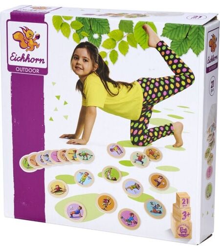 Das Eichhorn Bewegungsspiel besteht aus 20 bunten Spielscheiben aus Holz, die mit lustigen Motiven die Kleinen zum Bewegen, Tanzen, Turnen und Auslassen animieren. Das Set verbindet damit Spiel und Sport. Die Spielscheiben deuten den Kindern bestimmte Übungen und Bewegungen an, die sie spielerisch nachahmen und umsetzen sollen. Der eigenen Kreativität sind dabei selbstverständlich keine Grenzen gesetzt. Zum Aufbewahren liegt dem Spieleset ein Stoffbeutel bei, in dem alle 20 Teile problemlos verstaut und überall hin mitgenommen werden können. Das Bewegungsspiel ist das perfekte Spielzeug für Kinder ab 3 Jahren und verspricht frischen Wind im Garten, Park und in jedem Urlaub. ...
