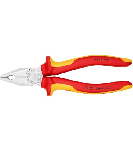 Die Knipex Kombizange 03 06 180 ist aus Spezial-Werkzeugstahl geschmiedet und mehrstufig ölgehärtet. Die Schneiden sind zusätzlich induktiv gehärtet und bieten einen Härtegrad von ca. 60 HRC und schneiden mehrdrähtige Kupferkabel bis 16mm². Die Kombizange verfügt über verschiedene Greifzonen, für Flach- und für Rundmaterial. Die isolierten Griffe sind dank Mehrkomponenten-Hüllen besonders rutschsicher und komfortabel. Knipex-Werkzeuge, die das Sonderzeichen 1000 V tragen, sind für Arbeiten bis 1.000 Volt AC zugelassen. Damit sichergestellt werden kann, dass die Spezialisolierung tatsächlich den Spannungen standhält, wird jedes Werkzeug, bevor es das Haus Knipex verlässt, einer Durchschlagprüfung mit 10.000 V AC unterzogen. ...
