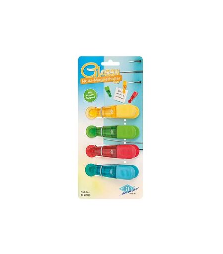 Die praktischen WEDO Klammern haben Ihre Notizen und Botschaften fest im GriffEgal ob Fotos als Dekoration oder Notizen als Erinnerung: Die bunten Notiz-Magnethalter von WEDO halten Ihre Zettel zuverlässig an Ort und Stelle. Die praktischen Klammern aus Kunststoff mit Softtouch-Griffflächen strahlen in schönen transparenten Farben. Ausgestattet mit einem starken Magneten haften sie auf allen metallischen Oberflächen und machen so zum Beispiel Kühlschränke oder Magnettafeln zu echten Hinguckern. Die Lieferung erfolgt im 4er-Set mit je einer Klammer in Gelb, Grün, Rot und Blau. Die Notiz-Magnethalter mit den Maßen 8,4 x 4,0 x 2,1 cm (HxTxB) halten bis zu 100,0 g Papier.Schaffen Sie mit den WEDO Notiz-Magnethaltern Ordnung oder hinterlassen Sie wichtige Nachrichten gut sichtbar. Bestellen Sie die bunten Klammern doch gleich hier im Online-Shop. Ihr Kühlschrank oder Ihre Magnettafel wird sich über schicke Gesellschaft ganz sicher freuen! ...