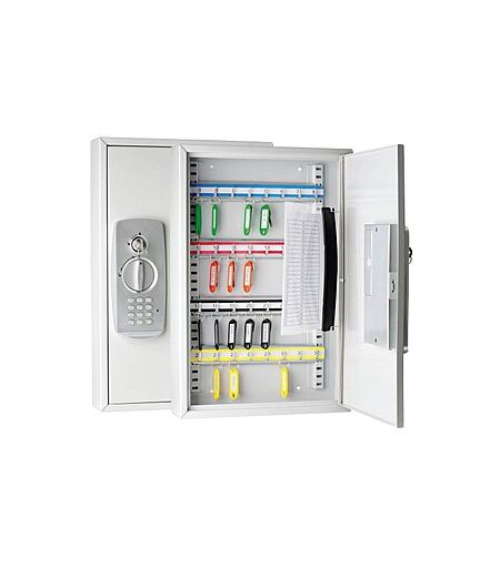 WEDO Schlüsseltresor grau mit 32 Haken Elektronik- und Standardschloss: die robuste SicherheitslösungEine zuverlässige Lösung für Ihre Schlüsselaufbewahrung ist der WEDO Schlüsseltresor grau mit 32 Haken Elektronik- und Standardschloss. Dieses Exemplar leistet Ihnen wertvolle Dienste, denn darin lassen sich Ihre Schlüssel sicher deponieren.Sicherheit geht vorVerschlossen wird per Elektronik- und Standardschloss. Um das Modell zu öffnen, muss ein **3- bis 8-stelliger Benutzercode eingegeben werden.Mehr zu MaterialDas Material Stahlblech, aus dem der Artikel besteht, ist sehr beständig. Außen veredelt und besonders widerstandsfähig ist das Modell durch seine Pulverbeschichtung. Eine Pulverbeschichtung bietet einen sehr hohen Schutz vor Rost und Schrammen. Die damit beschichteten Elemente erhalten so eine hohe mechanische Widerstandsfähigkeit.Alles zur SchlüsselaufbewahrungFür eine schnelle und effiziente Zuordnung Ihrer Schlüssel sind die Hakenleisten nummeriert, verstellbar und verschiedenfarbig. Hier finden bis zu 32 Schlüssel ihren Haken.Wie sind die Maße?Werfen Sie einen Blick auf folgende Maße: Die Breite beträgt 30,0 cm, die Tiefe 8,0 cm und die Höhe 45,0 cm. Gut zu wissen: Die Tür wird nach rechts geöffnet. Stellen Sie daher sicher, dass diese Öffnungsrichtung zum Einsatzort passt. Die Befestigung erfolgt über die 4 Bohrungen in der Rückwand. Das Gesamtgewicht ist nicht unwichtig und liegt bei 3,6 kg.Überzeugt Sie dieser Artikel?Zögern Sie nicht und bestellen Sie den WEDO Schlüsseltresor grau mit 32 Haken Elektronik- und Standardschloss mit wenigen Klicks gleich hier in unserem Shop. ...
