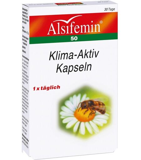 Nur eine Alsifemin® Klima-Aktiv-Kapsel pro Tag ist somit eine wertvolle Nahrungsergänzung für Frauen in den Wechseljahren.Wirkstoffe / Inhaltsstoffe / ZutatenAlsifemin Klima Aktiv mit Soja 1x1 Kapseln enthält:Zutaten: Soja-Extrakt 21%, Vitamin C, Kapselhülle Hydroxypropylmethylcellulose, Sojalecithin 6,8%, Niacin, Trennmittel Magnesiumsalze der Speisefettsäuren, Vitamin E, Eisen-(II)-fumarat, Pantothensäure, Maltodextrin, Zinkoxid, Trennmittel Siliciumdioxid, Vitamin B2, Vitamin B6, Vitamin B1, Biotin, Folsäure, Vitamin D, Vitamin B12.