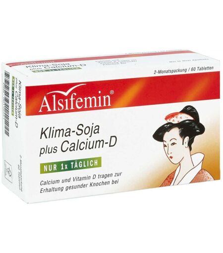 und Soja-Extrakt. Alsifemin Klima Soja + Calcium Vitamin D Tabletten enthalten spezielle, auf den Bedarf der Frau in und nach den Wechseljahren abgestimmte Mikronährstoffe. Calcium und Vitamin D tragen zur Erhaltung gesunder Knochen bei. Folsäure, Vitamin B6 und B12 unterstützen einen normalen Homocystein-Stoffwechsel. Vitamin B6 trägt zur Regulierung der Hormontätigkeit bei. Die Tabletten enthalten neben den aufgeführten Mikronährstoffen ebenfalls Soja-Extrakt, der reich an Isoflavonen ist. Nur eine Tablette Alsifemin® Klima-Soja plus Calcium-D pro Tag ist somit eine wertvolle Nahrungsergänzung für Frauen in und nach den Wechseljahren.