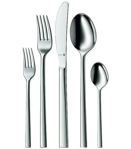 Mit stilsicherer Eleganz, schlanken Konturen und geschmeidig-makellosen Übergängen begeistert das WMF Besteck-Set Sonic nicht nur ausgewiesene Liebhaber preisgekrönten Designs. Ergonomisch geformt, liegt das spülmaschinenfeste Besteck perfekt in der Hand und überzeugt darüber hinaus dank des patentierten Härteverfahrens Cromargan protect® mit hoher Widerstandsfähigkeit gegen alltägliche Gebrauchsspuren und Kratzer. Das 66-teilige Sonic Besteck-Set beinhaltet 12 Menuegabeln, 12 Menuemesser, 12 Menuelöffel, 12 Kuchengabeln, 12 Kaffeelöffel, 1 Salatbesteck (2-teilig) 1 Servierlöffel, 1 Portionsschöpfer, 1 Serviergabel und 1 Tortenheber. Stilsichere, schlanke Formgebung Das preisgekrönte, von Casini & Pringiers entworfene Besteck Sonic von WMF besticht durch schlanke Konturen und makellose Übergänge mit stilsicherer Eleganz auf jedem Tisch. Edle Optik, angenehme Haptik Ein Genuss im täglichen Gebrauch: WMF Besteck verbindet einzigartiges Design mit höchster Qualität. Jedes Stück bietet eine angenehme Haptik und liegt perfekt in der Hand. Cromargan protect® Die mit dem patentierten Härteverfahren Cromargan protect® behandelten WMF Bestecke sind extrem widerstandsfähig gegen Kratzer und Gebrauchsspuren. Polierte Oberflächen bleiben glänzend, während matte Oberflächen matt bleiben. Für eine langanhaltende, makellose Schönheit. ...