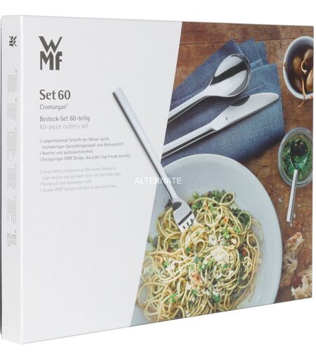 Das 60-teilige WMF Besteck-Set BOSTON ist für 12 Personen ausgelegt und bietet eine gute Basis für tägliches Speisen. Reduziert pur und unkompliziert im Design, gefallen die einzelnen Besteckteile vor allem durch ihre Schlichtheit, auf Details wurde bewusst verzichtet. Nur die abgerundeten Kanten sind dezent auffällig. Die 60 Teile passen zu vielen Speisen und Gängen, es sind je zwölf Menügabeln, Menümesser und Menülöffel, außerdem passende Kuchengabeln und Kaffeelöffel. Sie können für eine vollendete Tischkultur mit weiteren darauf abgestimmten Servier- und Ergänzungsbestecken vervollständigt werden. Für die BOSTON-Bestecke werden Monoblocmesser gefertigt, deren geschwungene Klingen ein gutes Streichvolumen bieten. Dank seines zeitlosen Designs hinterlassen sie mit ihrer polierten Oberfläche einen glänzenden Eindruck. ...
