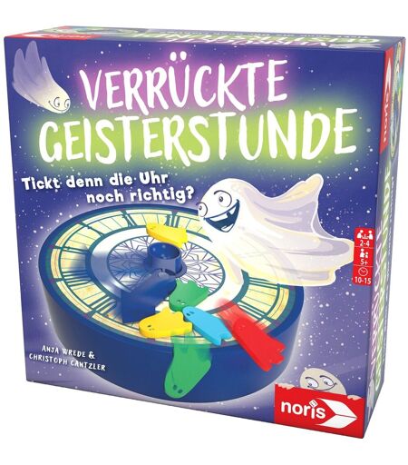 Willkommen in der Geisterrunde zur verrückten Geisterstunde! Kurz vor Mitternacht versammeln sich die Geister zu ihrem Geistertanz an der alten Turmuhr. Aber die Uhr tickt doch nicht richtig - der alte Zeiger ist in der Mitte angeknackst und bewegt sich wie er will. Es wird für die Geister nicht leicht, so auf dem Ziffernblatt zu tanzen. In mehreren Runden versucht die Spieler, ihre Geister auf die Uhr zu legen. Doch der verrückte Zeiger dreht sich wild vor und zurück und fegt dabei die Geister von der Uhr. Erst wenn die Uhr stehen bleibt, sind die Geister in Sicherheit. Wer dann am meisten seiner Geister auf der Uhr liegen hat, gewinnt die Runde. Wer es schafft, vier Runden zu gewinnen, gewinnt das Spiel. ...