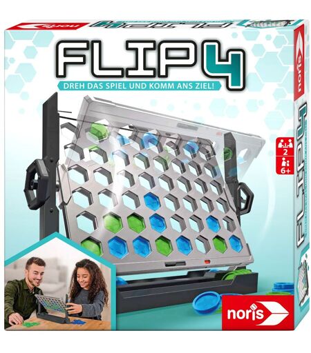 Bei dem Spiel Flip4 von Noris ist Mitdenken und räumliches Vorstellungsvermögen bei den Kids ab sechs Jahren gefragt! ab 6 Jahren für 2 Spieler drehbares Spielbrett mit Basis und 48 Chips in 2 Farben, Spielregeln Wer schafft es zuerst die vier Chips in einer Reihe vollzumachen – wenn sich das Spielbrett dabei dreht? Das Kind gewinnt, dass zuerst vier der Chips in eine waagrechte, senkrechte oder diagonale Reihe bringt. Abwechselnd werden Chips oben ins Spielbrett eingeworfen – doch was ist, wenn das Spielbrett plötzlich auf dem Kopf steht? Denn das Spielbrett lässt sich in dieser Variante des Klassikers „4 gewinnt“ um 180 Grad durch seitlich platzierte Räder drehen. ...