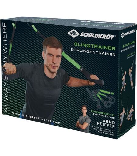 Die neue nochmals verbesserte Version des Schildkröt Sling Trainers ist das mobile Fitnessstudio und ihr persönlicher Begleiter auf jeder Reise. Kleines Packmaß in der beiliegenden Tasche, die einfache Montage an jeder Tür sowie der blitzschnelle Aufbau ermöglichen ein vielseitiges Fitnesstraining wo immer sie gerade sind. Das unendliche Übungsspektrum mit dem Slingtrainer ermöglicht das Trainieren fast aller Körperpartien, durch die oft instabile Lage beim Training wird zusätzlich die so wichtige Tiefenmuskulatur trainiert. Eine Auswahl an Übungen finden sie auf dem Schildkröt-Fitness Youtube Channel, der entsprechende QR Code ist am Produkt. Der Schildkröt Sling Trainer verfügt über ein hochwertig verarbeitetes stufenlos verstellbares Gurtsystem (Länge 180cm, Breite 4 cm, mehrfach vernäht) und ist so anpassbar an jede Körpergröße. Das Gerät ist wie ein mobiler Kraftrauam - mit dem speziell beliegenden Türanker ist er schnell und einfach an jeder Tür montiert. Ein mitgeliefertes rotes Warnschild für die andere Türseite schützt vor unerwartetem Stören oder Türöffnen während des Trainings. Beim Sling- / Suspension Training mit dem eigen Körpergewicht (bis max 120kg) werden die Muskeln der ganzen Muskelkette trainiert. Das vielseitige Fitnesssortiment der Marke Schildkröt bietet seit 2013 eine große Auswahl an Kleinfitnessgeräten für den Gebrauch zu Hause oder unterwegs. Durch den hohen Bekanntheitsgrad konnte sich Schildkröt im Fitnessbereich sehr schnell im Markt etablieren. Heute decken renommierte Fachhändler den Bereich Kleinfitnessgeräte mit Schildkröt ab. Zusätzlich wurde Schildkröt in der Rubrik „Fitness“ erst kürzlich und zum dritten Mal in Folge von den Händlern Deutschlands in der SAZ zum „Besten Hersteller“ des Jahres gekürt. 7 Jahre nach Markteinführung erneuert die deutsche Traditionsmarke in ihrem Fitness-Segment den Markenauftritt komplett und präsentiert für das Jahr 2020 ein neues, dynamisches und ansprechendes Verpackungskonzept. Der neue Look passt sich optimal an die aktuellen Trends und Marktgegebenheiten an. Im Zuge des umfassenden Marken-Relaunchs konnte Schildkröt mit Arnd Peiffer auch den derzeit erfolgreichsten deutschen Biathleten als neuen Markenbotschafter gewinnen. Der in Niedersachsen geborene Wahl-Bayer Peiffer blickt auf viele Medaillen, Olympia-Siege (u.a. Olympia-Gold im 10-km-Sprint 2018 in Pyeongchang) und Weltmeister-Titel zurück. Für seine Leistungen in der Saison 2018/19 wurde der amtierende Weltmeister außerdem mit dem Goldenen Ski ausgezeichnet, der als höchste Auszeichnung unter den deutschen Ski-Sportlern gilt. Schildkröt bietet eine Vielzahl von Trainingsmethoden und Anweisungen für seine Fitness Produkte. Scannen Sie den QR-Code auf der Verpackung oder besuchen Sie unsere Website, um Tipps und Schulungsvideos zu erhalten. ...