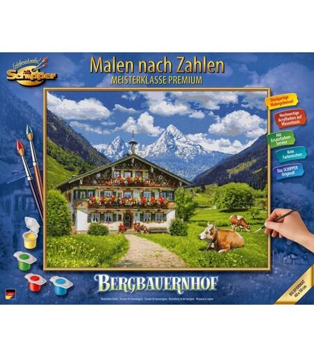 Ein idyllischer Bauernhof in beeindruckender Voralpenlandschaft mit grasenden Kühen auf saftigen Weiden, dichten Wäldern und schneebedeckten Bergen. Im Mittelpunkt steht das reich verzierte Bauernhaus mit farbenprächtigem Blumenschmuck auf den Holzbalkonen. Das Motiv ist in den hellen leuchtenden Farben des Sommers gehalten und strahlt Ruhe und Harmonie aus. Es ist zugleich eine Hommage an die Schönheit naturbelassener Berglandschaften. Ein ausdrucksstarkes Bekenntnis der Naturliebe im Rahmen des Hobbymalens. Das Bildformat und Malvorlage: MEISTERKLASSE Premium. Bilder im Hoch- oder Querformat von 40 x 50 cm, neben- oder untereinander gruppiert, eignen sich besonders gut für eine Bildergalerie. Die Malvorlage hat eine fühl- und sichtbare Leinenstruktur. Sie bewirkt nicht nur eine wesentlich verbesserte Optik des fertigen Gemäldes, sondern unterstreicht auch den malerischen Charakter des Bildes und unterstützt den gewünschten Öl-auf-Leinwand-Effekt. Hinweis: SCHIPPER Malen nach Zahlen hat für dieses Bildformat passende Alurahmen und Passepartouts im Angebot. Beachten Sie die Homepage - www.malennachzahlen-schipper.de Malthemen/Zubehör. Der Packungsinhalt: - Stabiler Malkarton mit Leinenstruktur 40 x 50 cm. - Exakte Konturenzeichnungen mit gut lesbaren Zahlen. - Acrylfarben auf Wasserbasis. Kein Farbmischen erforderlich. - Feiner Malpinsel. Kontrollblatt und ausführliche Anleitung für erfolgreiches Malen. ...