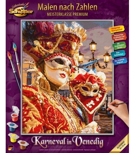 Der Karneval in Venedig hat eine lange Tradition. Einheimische und Touristen faszinieren die rauschenden Kostümfeste in den Palästen wie auch die typischen venezianischen Masken und prunkvollen Kostüme auf den Straßen, Brücken und Kanälen dieser beeindruckenden Lagunenstadt gleichermaßen. Das Motiv setzt den besonderen Zauber dieses Karnevals vor dem Hintergrund des Campanile des Markusdoms und dem Canale Grande glanzvoll und ausdrucksstark in Szene. Das Hobbymalen ermöglicht damit ein Eintauchen in die besondere Atmosphäre des einzigartigen „Carnevale di Venezia. ...
