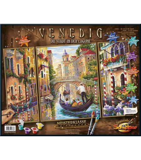 Schipper - Meisterklasse Triptychon, Der Gondoliere fährt sanft schaukelnd durch die malerischen Gassen der romantischen Stadt, die wie eine schwimmende Insel auf Wasser gebaut zu sein scheint. Mit den pittoresken Villen und Palästen zieht Venezia jeden Besucher in ihren Bann und schickt alle mit viel Charme in die glamuröse Zeit der alten Handelsstadt und Hochzeitspaare in den siebten Himmel. Der Hobbymaler genießt förmlich den venezianischen Lebensstil beim Malen dieses Bildes. ...