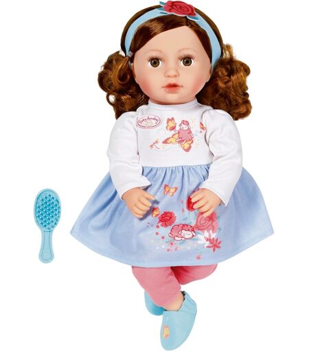 Ohhh, ein Erdbeer-Vanille-Eis-Falter! Sophia liebt Schmetterlinge und gibt ihnen immer Namen, die ihren liebsten Eissorten ähneln. Die Exemplare auf ihrem Kleid und den Schuhen sind gelblich wie Vanilleeis und an den Flügelspitzen rosa wie Erdbeereis – also sind das dann Erdbeer-Vanille-Eis-Falter, ganz klar… Das Kleid besteht aus einem weißen Oberteil und einem blauen Rock. Darunter trägt Sophia rosa Leggings. Ihr qualitativ hochwertiges braunes Haar lässts sich schön mit ihrer blauen Bürste kämmen und kann immer wieder zu neuen Frisuren gestylt werden. Das blaue Haarband mit Rose kommt in ihrer dunklen Haarpracht besonders gut zur Geltung. Bei Sophia steht Styling und An- und Ausziehen zwar hoch im Kurs, aber sie spielt auch gerne mit Kindern ab zwei Jahren. Dank ihres weichen Körpers ist die modische Stoffpuppe bestens zum Kuscheln geeignet. ...