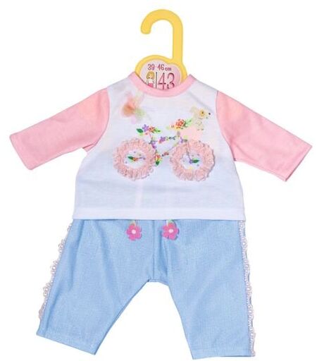 Klamotten tauschen ist so einfach wie Fahrrad fahren. Wenn man es einmal kann, verlernt man es nicht. Dank des lässigen Schnitts können BABY born, Baby Annabell und andere Puppen in einer Größe von 39-46 cm fröhlich die Kleidung hin und her tauschen. Das Fahrrad auf dem Longsleeve kommt mit ganz viel Flowerpower angesaust. Die Ärmel des weißen Langarmshirt, sowie der Kragen, sind in Rosa gehalten. An der Hose in Jeansoptik ist seitlich eine eine verspielte Borde eingearbeitet, die im Fahrtwind wunderbar weht. Die Bändel mit Blumenende am Hosenbund machen das blumige Outfit komplett. • Original Zapf Creation Kleidung für die Markenspielpuppen BABY born, Baby Annabell und andere Puppen in einer Größe von 39-46 cm. • Für Puppen in einer Größe von 39-46 cm. • Erweitert die Spielmöglichkeiten, regt die Fantasie an und fördert kreatives Rollenspiel. Dolly Moda Outfit mit Fahrrad 43cm aus Shirt und Hose. ...