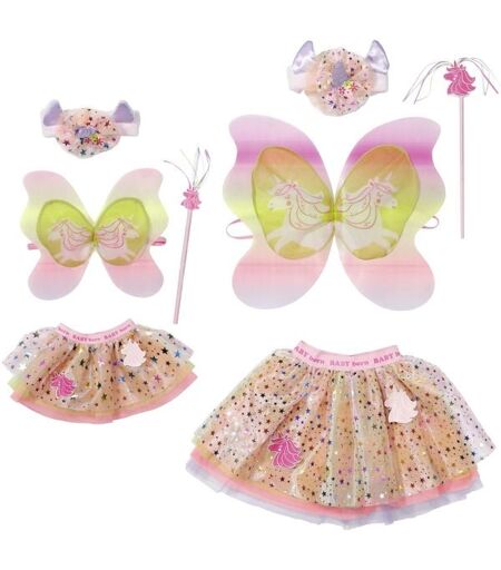 BABY born Einhorn Partnerlook Set Einfach den Einhorn-Zauberstab schwingen und schon stehen da zwei wunderbare Einhorn-Prinzessinnen. Nun ja, so einfach geht es dann doch nicht. Du musst dich und deine Puppe umziehen, damit die Verwandlung im Partnerlook perfekt wird.Das Set enthält jeweils das gleiche Outfit für das Kind, wie für die Puppe. Der Tüllrock ist mit glitzernden Sternchen und Einhorn-Applikationen versehen. Auf dem Stirnband mit putzigen Öhrchen thront ein Einhorn. Dass der Zauberstab ein Einhorn-Ende mit bunten Mähnen-Strähnen hat, ist eh klar. Und um das Outfit perfekt zu machen, trägt jeder noch Flügelchen mit pastelligem Farbverlauf. Das Set ist für Kinder in einer Größe von ca. 98-116cm geeignet. Hochwertiges Zubehör für die BABY born Markenspielpuppe. Für erweitertes, abwechslungsreiches und langanhaltendes Spielvergnügen. Für Kinder in einer Größe von ca. 98-116cm BABY born Einhorn Partnerlook mit Rock, Stirnband, Flügeln und Zauberstab jeweils für die Puppe und das Kind. ...