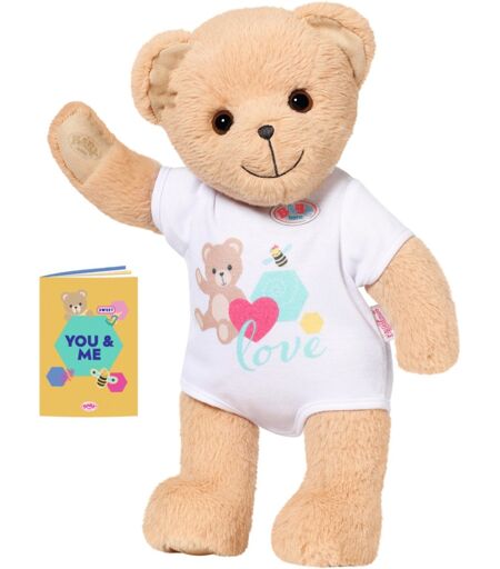 BABY born hat einen neuen Freund - und ihre Fans auch. Und dieser Teddy kann alles sein: Mädchen, Junge, Baby, Kuschelbär, Spielkameradin, Trostspender, Prinzessin oder Feuerwehrmann – und das von Kindesbeinen an, bis weit über das Puppenalter hinaus. Der kleine Bär mit dem süßen Lächeln hat einen weich gestopften Körper. Zu seiner Erstausstattung gehört ein weißer Strampler. Er hat eine eigene Fashion-Kollektion und bärige Accessoires, kann aber auch fast alles von BABY born anziehen und das Zubehör benutzen. Seine Figur ist so gestaltet, dass ihm nahezu alle Kleidungsstücke von BABY born mit 43 cm passen. Nur die Schuhe, die passen ihm nicht. Aber welcher Bär braucht schon Schuhe? Durch die beweglichen Arme, Beine und den drehbaren Kopf kann er einfach an- und ausgezogen werden. Wer darf sich wohl zuerst ins Freundschaftsbüchlein mit extra Stickerbogen eintragen? ...