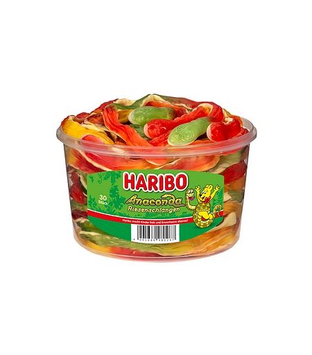 Eine extra lange Nascherei. Mit 35 cm Länge und 45 g Gewicht sind die HARIBO Anaconda Riesenschlangen wirklich XXL. Dieser Stückartikel ist eine Kombination aus Fruchtgummi und Schaumzucker und in den Geschmacksrichtungen Saftorange/Erdbeere, Himbeere/Erdbeere, Himbeere/Zitrone in der Runddose erhältlich. ...