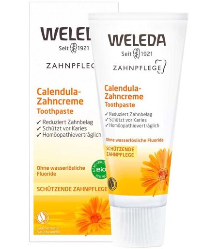 Wirkungsweise von Weleda Calendula ZahncremeWeleda Calendula Zahncreme ist konzipiert für Menschen, die auf Pfefferminzöl verzichten möchten - zum Beispiel während einer homöopathischen Behandlung. Mildes ätherisches Fenchelöl gibt, als Alternative zum klassischen Pfefferminzgeschmack, ein frisches Mundgefühl. Ein mineralischer Putzkörper aus Calciumcarbonat (Kreide) reinigt die Zähne sanft und gründlich. Durch regelmäßiges Putzen mit der Weleda Calendula Zahncreme wird Zahnbelag zuverlässig entfernt und so Karies vorgebeugt. Ein Auszug aus beruhigender Calendula beugt Irritationen vor und hilft, den gesamten Mundraum gesund zu halten.