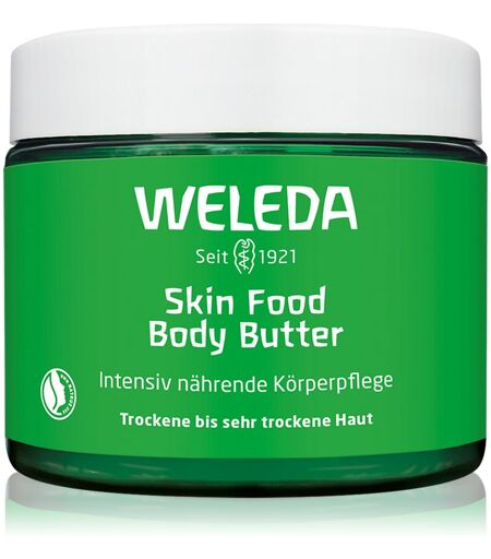 Weleda Skin Food, 150 ml, Körperbutter für Damen, Haben Sie das Gefühl, dass Ihre Haut eine intensivere Pflege benötigt, als die von Bodylotions oder Cremes? Die Körperbutter Weleda Skin Food ist die ideale Wahl für Sie. Im Vergleich zu herkömmlichen Cremes und Bodylotions enthält sie weniger Wasser und bietet eine dickere Konsistenz, was sie zu einem nährstoffreicheren und konzentrierteren Pflegeprodukt macht. Sie spendet der Haut tiefenwirksam Feuchtigkeit und Nährstoffe und hinterlässt sie fühlbar weich. Sie verwöhnt sie mit einer samtig-cremigen Textur und sorgt für eine lang anhaltende Wirkung. Tragen Sie die Butter einfach nach der Dusche oder dem Bad auf die Haut auf und machen Sie Ihre tägliche Pflegeroutine zu einem außergewöhnlichen Erlebnis. Eigenschaften: spendet Feuchtigkeit pflegt und regeneriert intensiv macht die Haut fühlbar weich verhindert das Austrocknen hinterlässt keinen Fettfilm auf der Haut leicht aufzutragen, zieht schnell ein duftet angenehm Anwendung: Auf die saubere Haut des ganzen Körpers auftragen und einmassieren. Nach Bedarf verwenden. ...