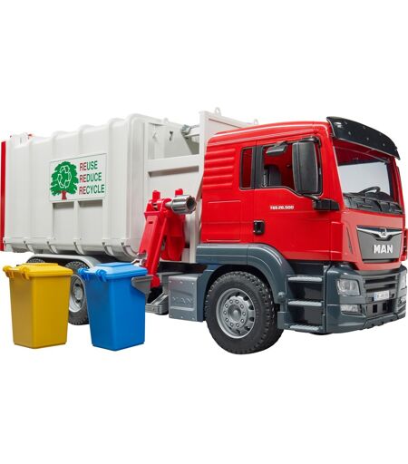 Der MAN TGS ist der perfekte Allrounder für Baustelle, Fernverkehr und Nahverteilung. Robust gebaut, mit durchzugsstarken Motoren ausgestattet und mit einer überdurchschnittlichen Nutzlast ist dieser LKW der Prototyp für den viel beschriebenen „Alleskönner“ der jede Menge Innovationen an Bord hat. Neu in der bruder MAN-TGS-Flotte ist ein moderner Müll-Seitenlader LKW. Ein seitlich ausfahrbarer Lifter greift die Mülltonnen und entleert sie ohne Zutun einer zweiten Person, zwei Schneckenpressen befördern den Müll im Inneren des Ladekörpers nach hinten. Zum Entleeren, wird nach Öffnen der Heckklappe, der Aufbau gekippt. Mit diesem detailgetreuen Spielzeug kann das spannende Thema ‘Abfall Entsorgen‘ realitätsnah nachgespielt werden – „just like the real thing.“ ...