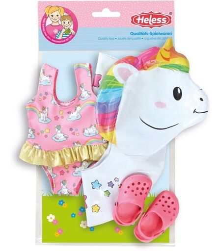 Mit dem Einhorn-Schwimmset von Heless ist die Puppe der absolute Star auf jeder Pool- und Badewannenparty. Der niedliche Einhorn-Schwimmreif besticht durch seine kunterbunte Mähne und Schweif in den prächtigsten Regenbogenfarben. Mit einem Badeanzug in passendem Einhorn-Design und mit gold schimmernden Rüschen kann sich die Puppe besonders stylisch ins Planschvergnügen stürzen. Dieser besteht aus besonders elastischem Material und lässt sich somit kinderleicht an- und ausziehen. Abgerundet wird das tolle Set durch farblich passende rosa-farbene Puppen-Clogs. Ein Must-have für warme Sommertage oder das nächste Badewannenabenteuer. Dieses Set passt den meisten marktgängigen Puppen der Größe 35-45 cm. ...