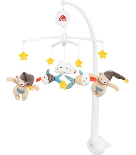 Nächte sind zum Träumen da! Das bezaubernde Musik-Mobile aus der Bruno Kollektion von Fehn wird Babys Herz im Nu erobern. Der flauschige Bär Bruno und sein Freund Sammy, der Sägefisch nehmen kleine Weltentdecker mit auf ihre Reise ins Land der Träume. ab Geburt geeignet Größe: Ø 40 cm Spieluhr mit An-/Ausschalter Melodie sortiert Das mechanische Spielwerk mit An/Aus-Schalter ist schnell aufgedreht und es erklingt eine sanfte Melodie in angenehmer Lautstärke. Der Nachwuchs wird beruhigt, getröstet und sanft in den Schlaf gewogen. Tagsüber wecken die tanzenden Figuren Babys Neugier und animieren zum Lauschen, Beobachten und Staunen. Sanfte Farben, zarte Muster und abwechslungsreiche Oberflächen regen die Wahrnehmung an. Die kleinen Sterne sind ein zusätzlicher Hingucker. Zum Spielen und Waschen lassen sich die Figuren abnehmen. Das Mobilegestänge im zeitlosen Design ist leicht zu befestigen. So wird das Musik-Mobile Bruno sicher schnell unentbehrlich am Bett kleiner Träumer. ...