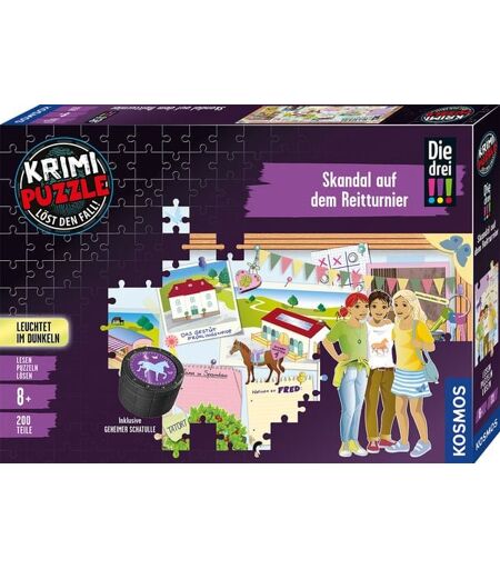 Aufregung auf dem Reitturnier! Wer steckt hinter den seltsamen Vorfällen beim Springwettkampf? Was genau ist beim Hindernisparcours geschehen? Gemeinsam mit den drei !!! Kim, Franzi und Marie helfen Kinder ab 8 Jahren bei den Ermittlungen auf dem Pferdegestüt. Die beiliegende Kurzgeschichte führt sie mitten in einen spannenden Fall. Puzzleteil für Puzzleteil finden die Ermittlerinnen und Ermittler wichtige Hinweise, mit denen sie dem Täter auf die Spur kommen. Geniales Extra: eie rätselhafte Geheim-Schatulle in dem sich ein wichtiges Indiz befindet! Können die Kinder alle Hinweise richtig kombinieren und den Fall lösen? Cool: das fertige Puzzle aus 200 Teilen leuchtet im Dunkeln! ...