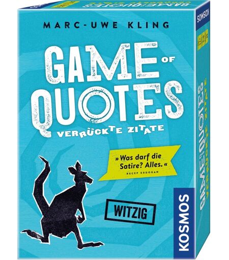 Jeder wählt ein Zitat – bekannt aus Marc-Uwe Klings Känguru-Büchern – und schiebt es einem falschen Autor unter. In fünf abwechslungsreichen Runden mit steigendem Schwierigkeitsgrad kann jeder seine Kreativität beim Verrücken der Zitate beweisen. Wer sich lustige Kombinationen ausdenkt, wird von den anderen nicht nur mit Gelächter, sondern auch mit WITZIG-Stempeln belohnt und gewinnt dadurch vielleicht das Spiel. ...