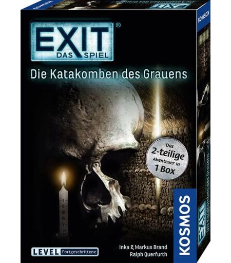 Düstere Gewölbe unter der Stadt der Lichter. Die Katakomben von Paris verschlucken das Licht, Geheimnisse und scheinbar auch Personen. Nach dem mysteriösen Verschwinden eines Freundes in den Katakomben, machen sich die Spieler auf die geheimnisvolle Suche durch das unterirdische Labyrinth. Schaffen es die Spielerinnen und Spieler rechtzeitig ihren Freund zu finden und der Höhlenwelt voller dunkler Mysterien zu entkommen? Mit der Reihe EXIT® – Das Spiel bringt KOSMOS das Gefühl der Live-Escape-Rooms zu euch nach Hause. Jede Box bietet einer Gruppe von 1 bis 4 Personen ein außergewöhnliches Spielerlebnis für einen einmaligen und absolut unvergesslichen Abend! Der Wettlauf gegen die Zeit und die cleveren Rätsel dieser innovativen Spielreihe sorgen für Spannung und geistige Herausforderung in den eigenen vier Wänden. Um die Rätsel zu lösen und sich somit gemeinsam aus der misslichen Lage zu befreien ist Teamgeist gefragt! Also arbeitet gut zusammen, denn die Zeit läuft... Live-Escape-Feeling im Fortgeschrittenen-Level. Inhalt: 1 Decodier-Scheibe, 118 Karten, 5 seltsame Teile, 1 Brief, 1 Polaroid, 1 verschlossenes Poster, 3 Schädel, 1 Teelicht, 1 verschlossene Kiste, 1 Standfuß, 1 Spielanleitung ...