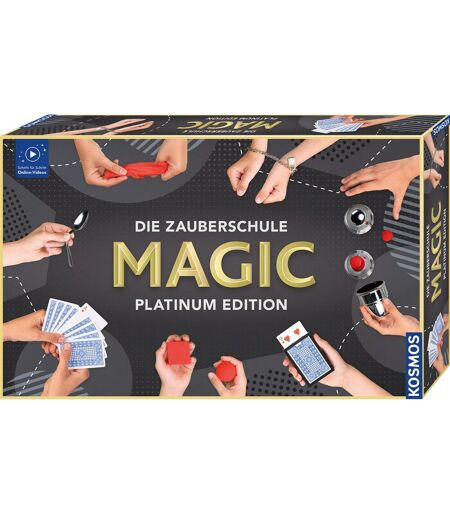 Vorhang auf für große Zauberer! Mit dem Zauberkasten „Die Zauberschule MAGIC Platinum Edition“ die zauberhafte Welt der Magie eintauchen! Angehende Zauberkünstler erlernen geniale Illusionen und Tricks mit magischem Equipment. Die ausführliche Anleitung führt Kinder ab 8 Jahren durch unzählige Übungen mit Zauberdaumen, Zauberlöffel, magischen Kartendecks, Zauberbechern, Seilen, Bällen, UFOS und Co. Dabei lernen jungen Zauberer Genauigkeit, trainieren ihr schauspielerisches Talent und schulen die Konzentration. Lust auf noch mehr Magie? Online-Tutorials auf der KOSMOS-Webseite zeigen ganz besonders anspruchsvolle Übungen. Diese Schule macht riesig Spaß und sorgt für magische Momente im Kinderzimmer. Abrakadabra! ...