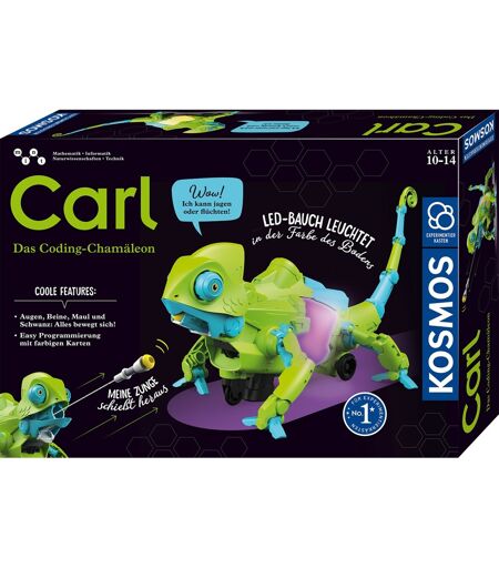 Hier kommt Carl: Bewegliche Beine und Augen, ein einstellbarer Schwanz, eine herausschnellende Zunge sowie der leuchtende, farbwechselnde Körper lassen diesen Roboter fast wie ein echtes Chamäleon aussehen und sorgen für stundenlangen Spiel- und Programmierspaß. Denn durch die geniale Möglichkeit, Carl den Chamäleon-Roboter selbst zu programmieren, können Kinder auch ohne Vorkenntnisse Carls Verhalten und seine Bewegungen vollständig selbst steuern! Ausgestattet mit verschiedenen Sensoren, „liest“ das Chamäleon die beigelegten Farbkarten und führt dann die programmierten Aktionen aus. ...