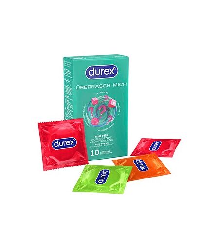 durex Kondome Überrasch’ Mich – Abwechslung für besondere MomenteMit den durex Überrasch’ Mich Kondomen bringen Sie Spannung und Vielfalt in Ihr Liebesleben. Die transparente Auswahl kombiniert gefühlsechte, genoppte, gerippte und aromatisierte Kondome – für immer neue Erlebnisse zu zweit.Vielfalt in einer PackungIn jeder Packung mit 10 Kondomen finden Sie einen aufregenden Mix: 2x Arouse Me, 2x Excite Me, 2x mit Erdbeer-Geschmack und 4x Gefühlsecht Classic. Alle Kondome sind einzeln verpackt, hygienisch und jederzeit griffbereit. Mit einer Breite von 56 mm bieten sie angenehmen Sitz und sicheren Schutz.Mehr Spaß, gleiche SicherheitOb mit Noppen, Rillen, Geschmack oder besonders gefühlsecht – jedes Kondom sorgt für neue Sinneseindrücke, ohne Kompromisse bei Sicherheit und Komfort. So wird Intimität abwechslungsreich und intensiv zugleich.Genießen Sie Schutz und prickelnde Vielfalt – mit den durex Überrasch’ Mich Kondomen. Bestellen Sie sie jetzt direkt hier im Online-Shop! ...