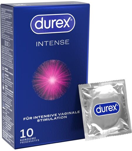 Latexkondome Durex Intense Orgasmic mit Rippen, Noppen und stimulierendem Desirex-Gel für wärmende, kühlende und prickelnde Effekte. Mit Minz-Aroma. Transparent und befeuchtet auf Silikonbasis. Im Vergleich zu herkömmlichen zylindrischen Kondomen bietet die innovative anatomische Easy-on-Form der Durex-Kondome an den richtigen Stellen etwas mehr Platz und gewährleistet so ein leichteres Anlegen und Abrollen sowie komfortablen Sitz und intensives Empfinden. Gesamtlänge 205 mm, Nennbreite: 56 mm. ...