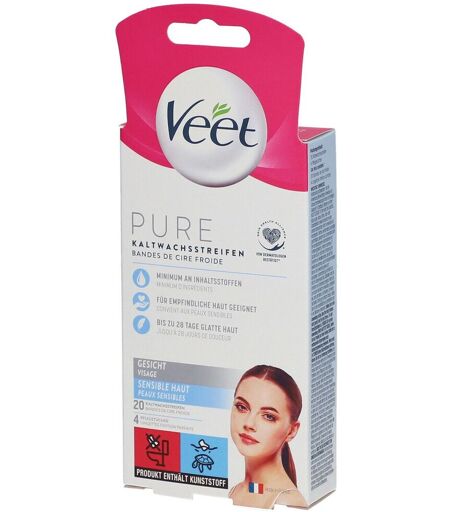 Mit Veet Kaltwachsstreifen können Sie sich über bis zu 4 Wochen seidig glatte Haut freuen. Die Gelformel mit Easy-GelwaxTechnology:Ummantelt und greift aktiv auch sehr kurze Haare*. (*1,5 mm)Entfernt Haare samt der Wurzel und verleiht eine geschmeidige Haut bis zu 28 Tage lang.Dadurch erhalten Sie langanhaltend glatte Haut ab der ersten Behandlung, selbst wenn Sie noch keine Erfahrung mit Kaltwachsstreifen haben. Der Streifen ermöglicht eine präzise Anwendung, weshalb er sich perfekt für kleine und empfindliche Bereiche wie die Oberlippe, Wangen und das Kinn eignet.Die spezielle Formel enthält Mandelöl.Für Sensible Haut mit Mandelöl und zartem DuftFür Oberlippe, Wangen & KinnDie Streifen müssen nicht mehr zwischen den Händen gerieben werden um Sie voneinander zu trennenDermatologisch getestetFür eine einfache Entfernung auch sehr kurzer HaareTreten Sie der Welt mithilfe der Veet Easy-GelwaxTechnology Präzisions-Kaltwachsstreifen für das Gesicht selbstbewusst entgegen.Sie verleihen Ihnen eine spürbar glatte Haut und sind ideal für die kleinen und empfindlichen Stellen wie Ihre Oberlippe, Wangen und Kinn. Wir haben die Streifenform optimiert um Ihnen eine präzisere Anwendung in den kleinen Bereichen zu ermöglichen.Und die Handhabung ist einfach! Mit der speziellen Easy GripAbziehlasche entfernen Sie die Haare mit einer einfachen Bewegung professionell und gründlich –für bis zu 4 Wochen glatte Haut.Die Streifen müssen nicht zwischen den Händen gerieben werden, um sie voneinander zu trennen!Sie erreichen hervorragende Ergebnisse in nur 4 einfachen Schritten:1. Ziehen Sie den Kaltwachsstreifen am runden Ende langsam auseinander.2. Bringen Sie den Wachsstreifen so an das das Ende in Haarwuchsrichtung zeigt. Streichen Sie ihn wiederholt in Haarwuchsrichtung glatt.3. Straffen Sie Ihre Haut. Fassen Sie die Lasche des Kaltwachsstreifens und ziehen Sie diesen entgegen der Haarwuchsrichtung, in einer möglichst schnellen Bewegung, flach an der Haut entlang ab.4. Entfernen Sie nach der Haarentfernung eventuelle Wachsreste mit einem PflegetuchDie Kaltwachsstreifen wurden für Oberlippe, Wange und Kinn entwickelt und sind nicht geeignet für andere Partien des Gesichts, Kopf, Ohren, Brust, Genital-oder Analbereich oder andere Körperpartien.Beachten Sie die folgenden Tipps für die besten Resultate:Die besten Resultate werden erzielt, wenn die Haare vor dem Wachsen mindestens 1,5 mm lang sind. Wenn sie länger als 5 mm, ist es angenehmer, wenn man die Haare vor dem Wachsen kürzt.Stellen Sie sicher, dass Ihre Haut trocken und frei von Creme-, Deo-oder Ölrückständen ist. Waschen Sie die Haut und verwenden Sie Talk oder Babypuder, besonders in den Achselhöhlen.Ein Peeling 24 Stunden vor der Wachsbehandlung ist eine gute Vorbereitung und liefert optimale Ergebnisse. Das lohnt sich insbesondere dann, wenn Sie unter eingewachsenen Haaren leiden.Wenn Sie die Haare für einen speziellen Anlass entfernen wollen, führen Sie die Wachsbehandlung 24 Stunden vorher durch,... ...