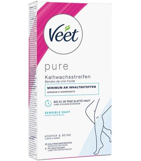Anwendungsgebiet von Veet Enthaarungsstreifen SensitiveVeet Enthaarungsstreifen Sensitive eignet sich für sensible, empfindliche Haut, die enthaart werden möchte.Wirkungsweise von Veet Enthaarungsstreifen SensitiveVeet Enthaarungsstreifen Sensitive sind Kaltwachsstreifen, die Ihnen über bis zu 4 Wochen seidig-glatte Haut schenken. Denn Veet Enthaarungsstreifen Sensitive mit seiner speziellen Rezeptur entfernt auch kurze Haare und entfernt diese mit einer einzigen Bewegung professionell und gründlich.