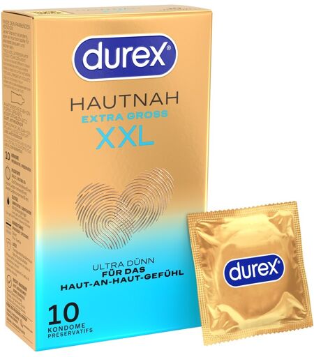 Transparente, ultra dünne Kondome Hautnah Extra Groß XXL von Durex für intensive natürliche Empfindungen. In großer Passform (nominale Breite 60 mm) für mehr Komfort. Mit Silikongleitgel befeuchtet. Die innovative anatomische Easy-on-Form bietet im Vergleich zu herkömmlichen zylindrischen Kondomen an den richtigen Stellen etwas mehr Platz – für leichteres Anlegen und Abrollen sowie komfortablen Sitz und pures Empfinden. 10 Stück. Nominale Breite 60 mm. Naturkautschuklatex. ...