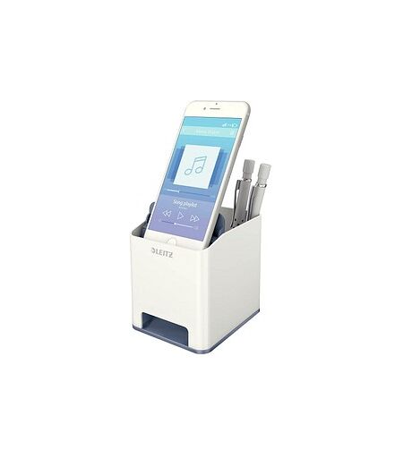 Ideal für moderne Arbeitsplätze: der Stifteköcher WOW Duo ColourDieser Stiftehalter von LEITZ ist up to date! Er hält nicht nur Ihre Schreibutensilien an Ort und Stelle, sondern auch Ihr Smartphone! Das integrierte Mobiltelefon-Fach ist so clever konzipiert, dass der gesamte Bildschirm des Smartphones sichtbar bleibt und das Klangvolumen dank Soundverstärkerfunktion erhöht wird. Dieser Stiftehalter in gewohnter LEITZ Premium-Qualität wird Ihren Arbeitsalltag erleichtern!Der LEITZ Stiftehalter bringt Ordnung auf den Schreibtisch. Stecken Sie Stifte, Lineale und Scheren einfach in das geräumige hintere Fach. Damit Sie eine gute Sicht auf Ihr Smartphone haben, platzieren Sie dieses einfach auf der vorderen Ablage. Der moderne zweifarbige WOW Duo Colour mit Smartphone Fach peppt Ihren Schreibtisch auf.Bringen Sie frischen Wind ins Büro und bestellen Sie den Stifteköcher WOW Duo Colour doch bequem bei uns im Online-Shop! Die Lieferung des Stiftehalters erfolgt ohne Inhalt. ...