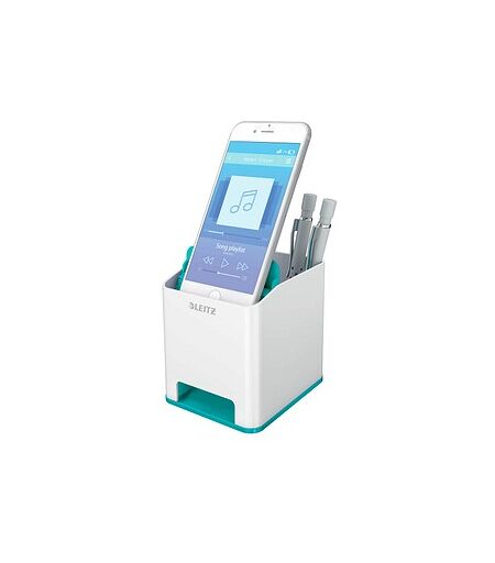 Ideal für moderne Arbeitsplätze: der Stifteköcher WOW Duo ColourDieser Stiftehalter von LEITZ ist up to date! Er hält nicht nur Ihre Schreibutensilien an Ort und Stelle, sondern auch Ihr Smartphone! Das integrierte Mobiltelefon-Fach ist so clever konzipiert, dass der gesamte Bildschirm des Smartphones sichtbar bleibt und das Klangvolumen dank Soundverstärkerfunktion erhöht wird. Dieser Stiftehalter in gewohnter LEITZ Premium-Qualität wird Ihren Arbeitsalltag erleichtern!Der LEITZ Stiftehalter bringt Ordnung auf den Schreibtisch. Stecken Sie Stifte, Lineale und Scheren einfach in das geräumige hintere Fach. Damit Sie eine gute Sicht auf Ihr Smartphone haben, platzieren Sie dieses einfach auf der vorderen Ablage. Der moderne zweifarbige WOW Duo Colour mit Smartphone Fach peppt Ihren Schreibtisch auf.Bringen Sie frischen Wind ins Büro und bestellen Sie den Stifteköcher WOW Duo Colour doch bequem bei uns im Online-Shop! Die Lieferung des Stiftehalters erfolgt ohne Inhalt. ...