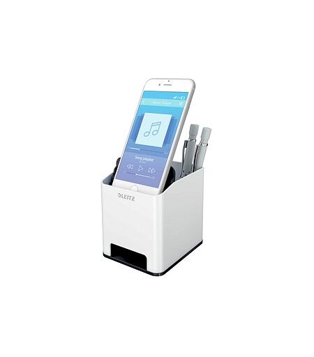 Ideal für moderne Arbeitsplätze: der Stifteköcher WOW Duo ColourDieser Stiftehalter von LEITZ ist up to date! Er hält nicht nur Ihre Schreibutensilien an Ort und Stelle, sondern auch Ihr Smartphone! Das integrierte Mobiltelefon-Fach ist so clever konzipiert, dass der gesamte Bildschirm des Smartphones sichtbar bleibt und das Klangvolumen dank Soundverstärkerfunktion erhöht wird. Dieser Stiftehalter in gewohnter LEITZ Premium-Qualität wird Ihren Arbeitsalltag erleichtern!Der LEITZ Stiftehalter bringt Ordnung auf den Schreibtisch. Stecken Sie Stifte, Lineale und Scheren einfach in das geräumige hintere Fach. Damit Sie eine gute Sicht auf Ihr Smartphone haben, platzieren Sie dieses einfach auf der vorderen Ablage. Der moderne zweifarbige WOW Duo Colour mit Smartphone Fach peppt Ihren Schreibtisch auf.Bringen Sie frischen Wind ins Büro und bestellen Sie den Stifteköcher WOW Duo Colour doch bequem bei uns im Online-Shop! Die Lieferung des Stiftehalters erfolgt ohne Inhalt. ...
