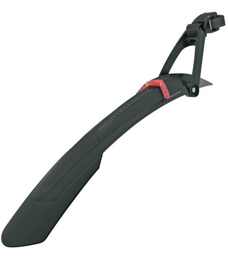 Bester Schutz mit LeuchtkraftDas MTB-Schutzblech NIGHTBLADE ist ein erhellendes Beispiel für integrierte Lösungen am Fahrrad. Und sieht dabei noch blendend aus! Es bietet dank des verstellbaren Frontspoilers und des extralangen Backspoilers nicht nur einen optimalen Spritzschutz. Durch das integrierte Rücklicht mit StVZO-Zulassung garantiert der Radschützer auch für mehr Sicherheit im Straßenverkehr. So ist der „ Nightrider“ auf dunklen nassen Wegen gleich doppelt geschützt.Der Rückstrahler mit integriertem Akku ist herausnehmbar und kann einfach über USB mit neuer Energie geladen werden. Die Spoiler aus weicherem Kunststoff dient gleichzeitig als Kantenschoner beim Auf- und Absteigen. Durch die einfache Quick-Release-Befestigung lässt sich das NIGHTBLADE mit Powerstraps an fast jede Sattelstütze montieren und durch die 2-Gelenk-Technik optimal ans Mountainbike anpassen. Die Schutzbleche sind für Bereifungen von 26‘ ‘ , 27,5‘ ‘ und 29‘ ‘ geeignet. ...
