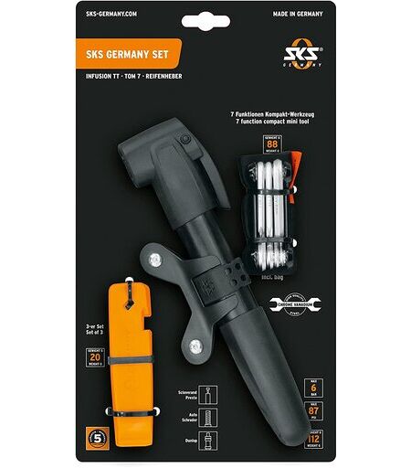 Das schlanke Multitool TOM 7 aus rostfreiem Werkzeugstahl vereint sieben Werkzeug-Funktionen in extremer Kompaktheit. Auch das 3er Reifenheber-Set LEVERMEN aus Hochleistungskunststoff mit abgerundeten Kanten ist unverzichtbar bei jeder Fahrradtour. Die SKS-Minipumpe INFUSION TT mit klappbarem T-Griff, Teleskop-Funktion und MULTI VALVE-Kopf für alle Ventilarten sorgt für ein bequemes Pumpen bis 6 bar. So lassen sich unterwegs fast alle Pannen am Fahrrad schnell beheben. ...