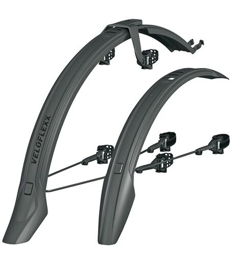 NACHWUCHS IN DER VELO-FAMILIE!Das Radschutz-Set VELOFLEXX vereint die Stabilität eines festmontierten Schutzbleches mit der Flexibilität eines Steckradschutzes. Da das VELOFLEXX einen durchgängigen Radschutz bietet, ist er nur mit Scheibenbremsen kompatibel. Durch die VELOFLEXX-Brücke lässt sich der Hinterradschutz mit Hilfe von Gummistraps oben an der Sitzstrebe werkzeugfrei befestigen. Diese Montage-Lösung ist auf die Querstrebe, an der normalerweise der Bremssattel der Felgenbremse befestigt ist, nicht mehr angewiesen. Vorne wird das VELOFLEXX an der Gabelbrücke mit einem gummierten Klettstrap oder Kabelbinder befestigt. Die Rahmenadapter machen die Montage an jeder Gabel möglich und sind zudem winkelverstellbar. Für noch mehr Halt sorgen die schwarz beschichteten Streben. ...