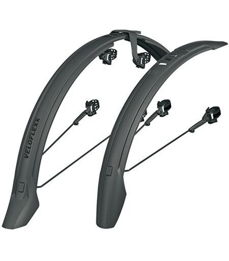 NACHWUCHS IN DER VELO-FAMILIE!Das Radschutz-Set VELOFLEXX vereint die Stabilität eines festmontierten Schutzbleches mit der Flexibilität eines Steckradschutzes. Da das VELOFLEXX einen durchgängigen Radschutz bietet, ist er nur mit Scheibenbremsen kompatibel. Durch die VELOFLEXX-Brücke lässt sich der Hinterradschutz mit Hilfe von Gummistraps oben an der Sitzstrebe werkzeugfrei befestigen. Diese Montage-Lösung ist auf die Querstrebe, an der normalerweise der Bremssattel der Felgenbremse befestigt ist, nicht mehr angewiesen. Vorne wird das VELOFLEXX an der Gabelbrücke mit einem gummierten Klettstrap oder Kabelbinder befestigt. Die Rahmenadapter machen die Montage an jeder Gabel möglich und sind zudem winkelverstellbar. Für noch mehr Halt sorgen die schwarz beschichteten Streben. ...