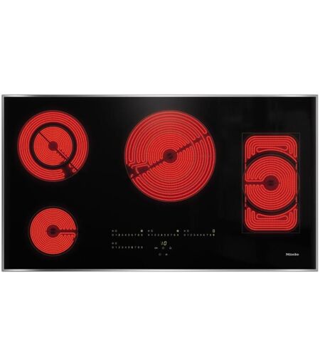 Das Miele-Plus: Intuitive Schnellanwahl durch Zahlenreihen - SmartSelect; Ansprechendes Design - 942 mm breit mit umlaufendem Rahmen; Besonders flexibel - 4 Kochzonen inkl 1 Bräter/2 Variozonen; Unübertroffen schnell - 1 ExtraSpeed-Kochzone; Kommunikation mit der Haube - Automatikfunktion Con@ctivity; Leistungseigenschaften 4 Kochzonen; Energieverbrauch der Kochmulde 187,6 Wh/kg; Gesamt-Leistungsaufnahme: 9,2 kW; 3x16 A Absicherung; 220-240V 50/60Hz Netzanschluss; Ausstattung Ankochautomatik; Warmhalte-Funktion; Sicherheitsabschaltung; Funktionssperre; Einschaltsperre; Abschaltautomatik; Stopp-Funktion; Fehlerüberwachung; Glas-Schaber; Systemsteuerung möglich; optionale Smart Home Funktion; Bedienung Bedienfeld vorne; Sensor-Tasten; Direktanwahl; Countdown-Timer/Kurzzeitwecker; Restwärmeanzeige; Restwärmeausnutzung; Digital-Anzeige für Kochstufen; Kochzonen-Erweiterung separat schaltbar; Restart-Funktion; Kochzone-vorne/außen links HiLight-Kochzone vorne links; Durchmesser der Kochzone: 14,5 cm; Heizleistung: 1200 W; Energieverbrauch 191 Wh/kg; stufenweise regelbar vorne links; 9 Heizstufen; Kochzone-hinten/innen links HiLight-Kochzone hinten links; Zweikreis-Kochzone hinten links; Durchmesser der kleinen Kochzone: 12 cm; Durchmesser der großen Kochzone: 21 cm; Heizleistung der kleinen Kochzone: 750 W; Heizleistung der großen Kochzone: 2200 W; Energieverbrauch 186,2 Wh/kg; stufenweise regelbar hinten links; 9 Heizstufen; Kochzone-hinten/innen rechts HiLight-Kochzone hinten rechts; Dreikreis-Kochzone hinten rechts; Durchmesser der kleinen Kochzone: 14,5 cm; Durchmesser der großen Kochzone: 27 cm; Heizleistung der kleinen Kochzone: 1050 W; Heizleistung der großen Kochzone: 3200 W; Energieverbrauch 186,2 Wh/kg; stufenweise regelbar hinten rechts; 9 Heizstufen; Kochzone-vorne/außen rechts HiLight-Kochzone vorne rechts; Bräter-Zweikreis-Kochzone vorne rechts; Durchmesser der kleinen Kochzone: 17 cm; Breite der Bräterzone: 29 cm; Heizleistung der kleinen Kochzone: 1500 W; Heizleistung der großen Kochzone: 2600 W; Energieverbrauch 187,2 Wh/kg; stufenweise regelbar vorne rechts; 9 Heizstufen; Gehäuse-Eigenschaften Breite: 94,2 cm; Tiefe: 52,6 cm; Höhe: 4 cm; Länge der Anschlussleitung: 1,44 m; Einbau-Eigenschaften Breite, Ausschnitt: 91,6 cm; Tiefe, Ausschnitt: 50 cm; Farben edelstahl; ...