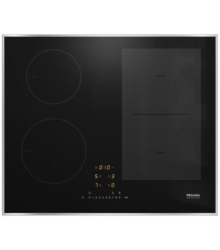 Das Miele Plus: Schnellanwahl per Zahlenreihe - ComfortSelect: ; 4 Kochzonen inkl. 1 leistungsstarken PowerFlex: -Kochbereich; In 626 mm Breite mit Edelstahlrahmen für aufliegenden Einbau; Kürzeste Ankochzeiten - TwinBooster: ; Kommunikation mit der Haube - Automatikfunktion Con@ctivity: ; Leistungseigenschaften: Gesamt-Leistungsaufnahme: 7.3 kW; 4 Kochzone(n); Energieverbrauch der Kochmulde 180 Wh/kg; 230 V Netzanschluss; Ausstattung: Ankochautomatik; Warmhalte-Funktion; Topferkennungssensor für jede Kochzone; Brückenbetrieb möglich; Turbo-Stufe; Sicherheitsabschaltung; Überhitzungsschutz; Funktionssperre; Einschaltsperre; Abschaltautomatik; Stopp&Go-Funktion; Kühlventilator; Steuerung für Dunstabzugshaube über Con@ctivity möglich; Systemsteuerung möglich; Option für EDV-geführtes Hausmanagement; Bedienung: Bedienfeld vorne; Sensor-Tasten; Direktanwahl; Countdown-Timer/Kurzzeitwecker; Restwärmeanzeige für jede Kochzone; Digital-Anzeige für Kochstufen; Kochzone-vorne/außen links: Induktions-Kochzone; autom. Topfdurchmesser-Erkennung; min. Durchmesser der Kochzone: 14 cm; max. Durchmesser der Kochzone: 19 cm; Max. Booster-Leistung: 2500 W; Max. TwinBooster-Leistung: 3000 W; Heizleistung: 1850 W; Energieverbrauch 174 Wh/kg; Kochzone-hinten/innen links: Induktions-Kochzone; autom. Topfdurchmesser-Erkennung; min. Durchmesser der Kochzone: 10 cm; max. Durchmesser der Kochzone: 16 cm; Max. Booster-Leistung: 1700 W; Max. TwinBooster-Leistung: 2200 W; Heizleistung: 1400 W; Energieverbrauch 180 Wh/kg; Kochzone-rechts: Induktions-Kochzone; stufenlos variierbares Kochzonen-Format PowerFlex-Kochbereich; autom. Topfdurchmesser-Erkennung; min. Durchmesser der Kochzone: 15 cm; max. Durchmesser der Kochzone: 23 cm; Max. Booster-Leistung: 4800 W; Max. TwinBooster-Leistung: 7300 W; Heizleistung: 3400 W; Gehäuse-Eigenschaften: Breite: 62.6 cm; Tiefe: 52.6 cm; Höhe: 5.2 cm; Gewicht: 11 kg; Länge der Anschlussleitung: 1.4 m; Einbau-Eigenschaften: Breite, Ausschnitt: 56 cm; Tiefe, Ausschnitt: 49 cm; Farben: edelstahl; ...
