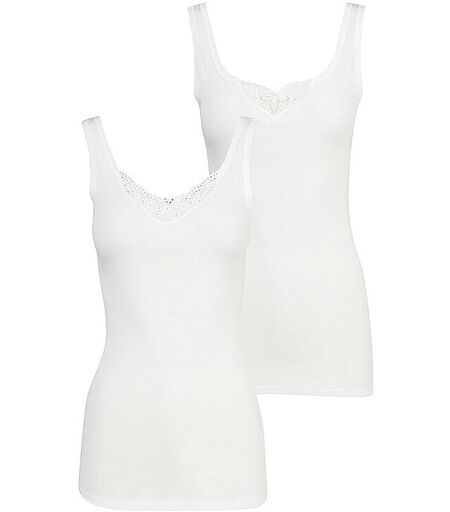 Damen-Unterhemd aus reiner Baumwolle 2-er Pkg. Rundhalsausschnitt Einsatz aus Spitze Ärmellos Körpernah geschnitten Farbe: weiß Material: 100% Baumwolle ...